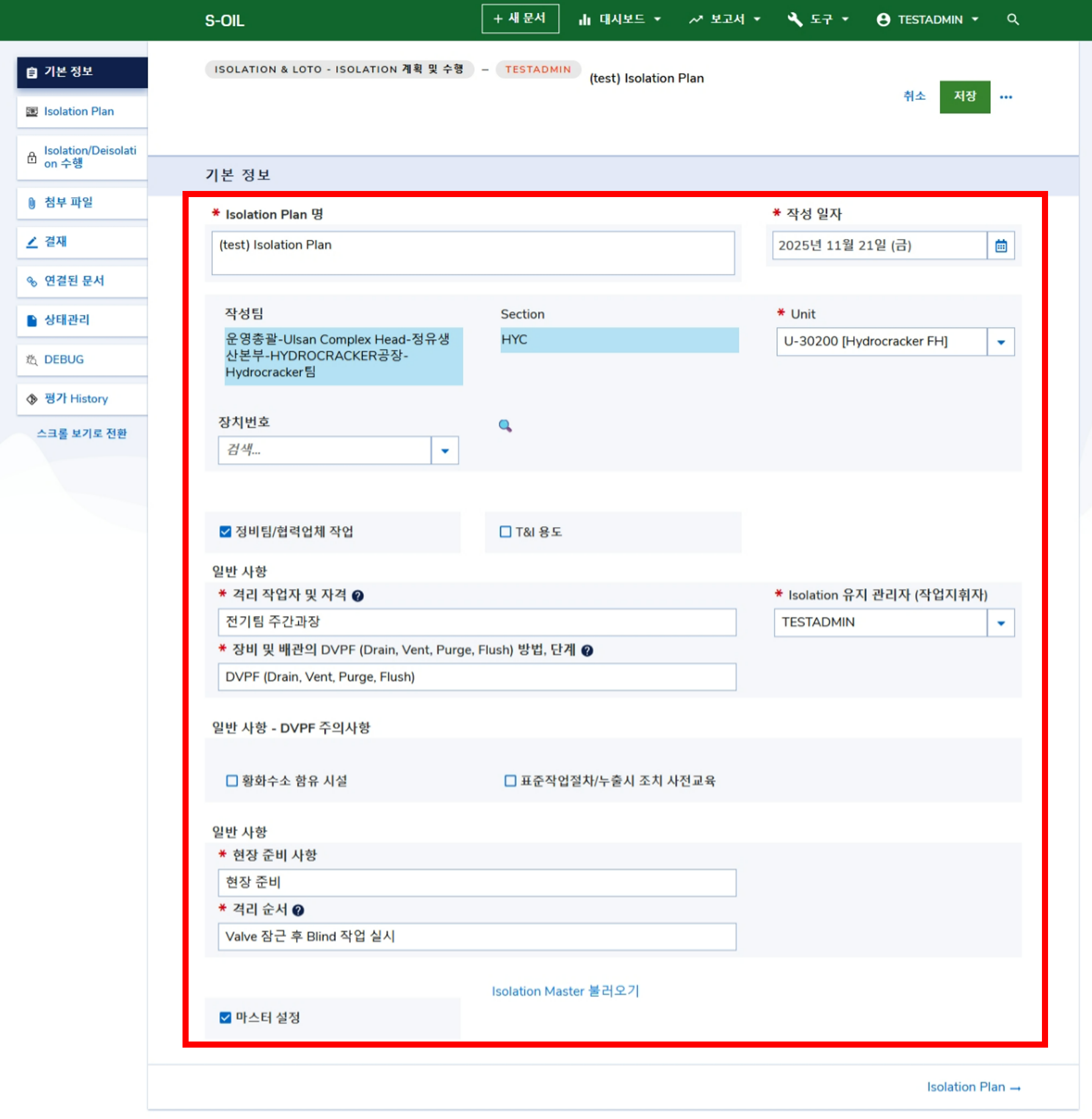 💡 JSA 처럼 Master를 등록해놓고 각 작업허가서에는 Isolation Plan을 불러오는 방식으로 바뀌었어요 !