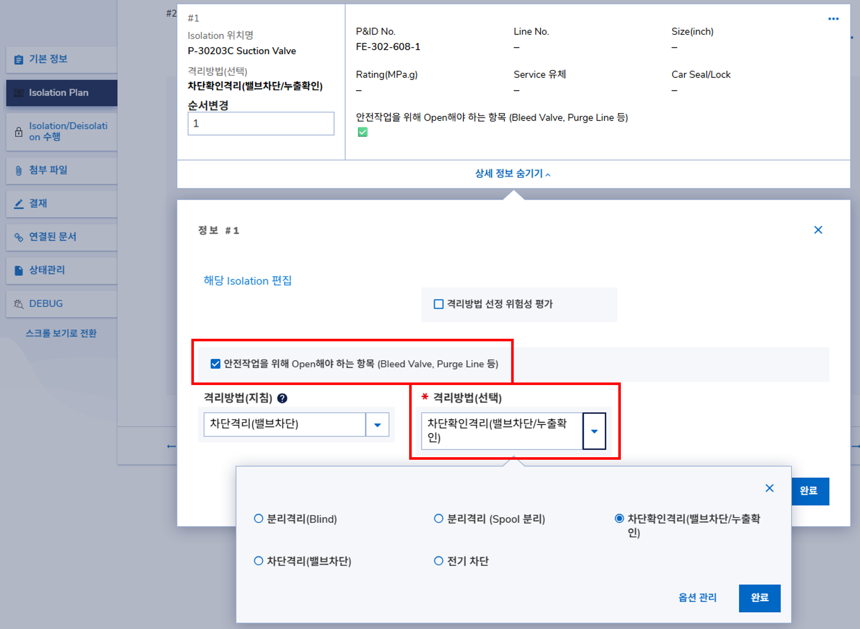 👉 Isolation 계획 및 수행 > Isolation Plan 탭 > 각 Isolation List 하부 '세부 정보 입력' Click > 격리방법 선택
