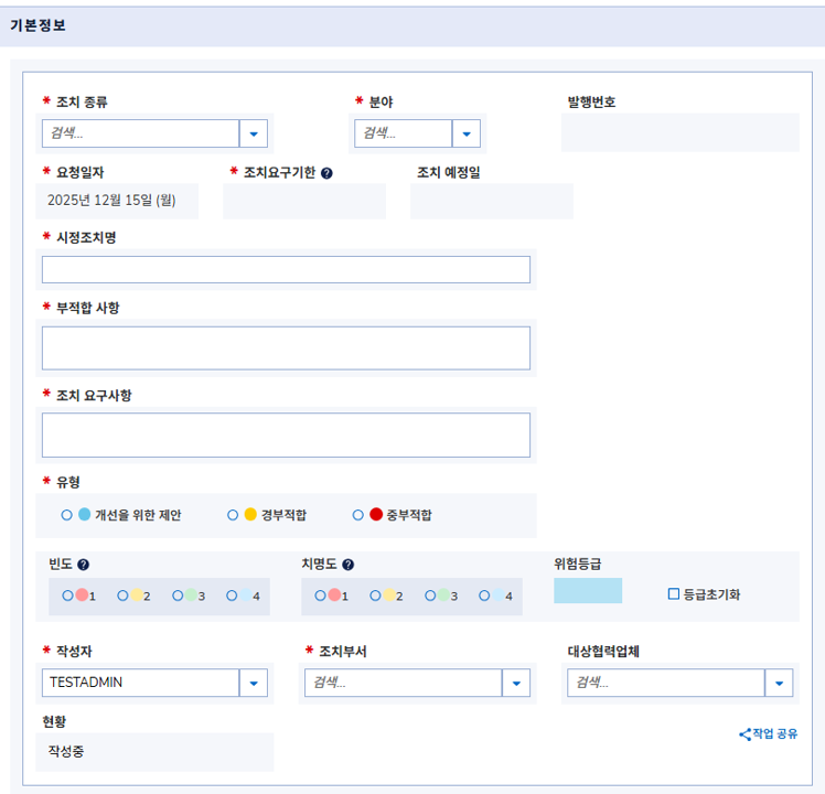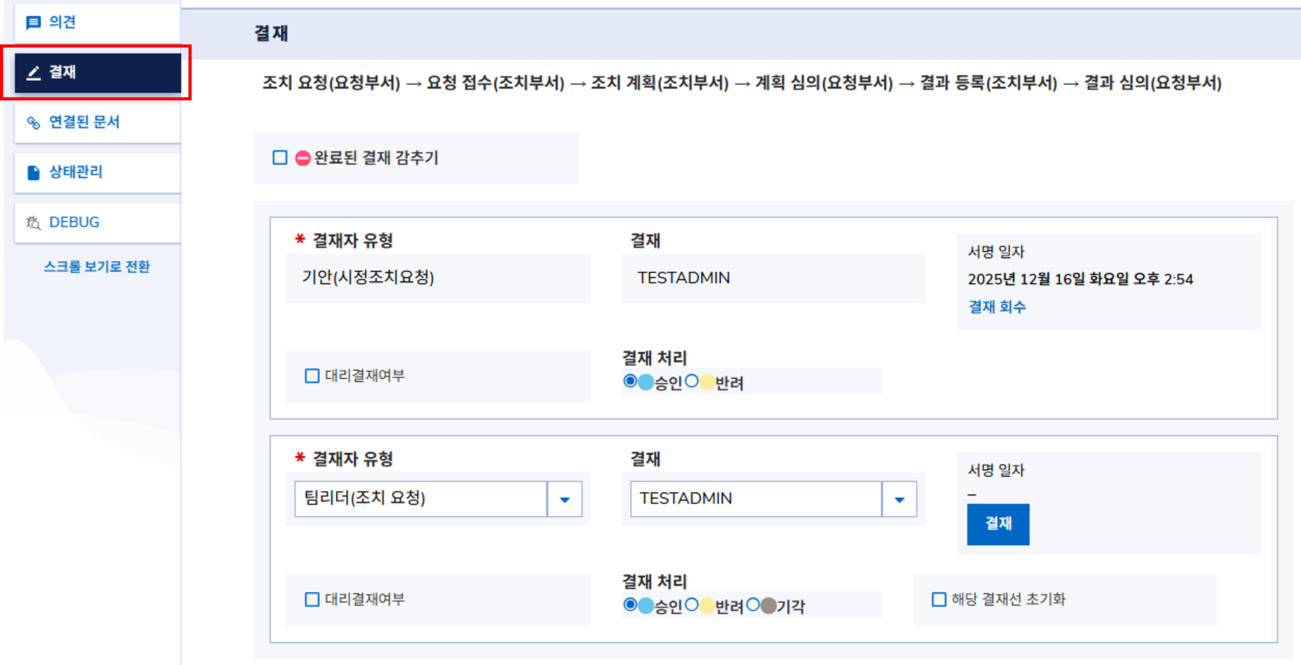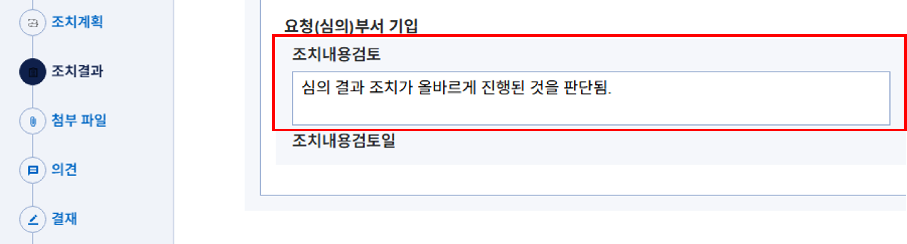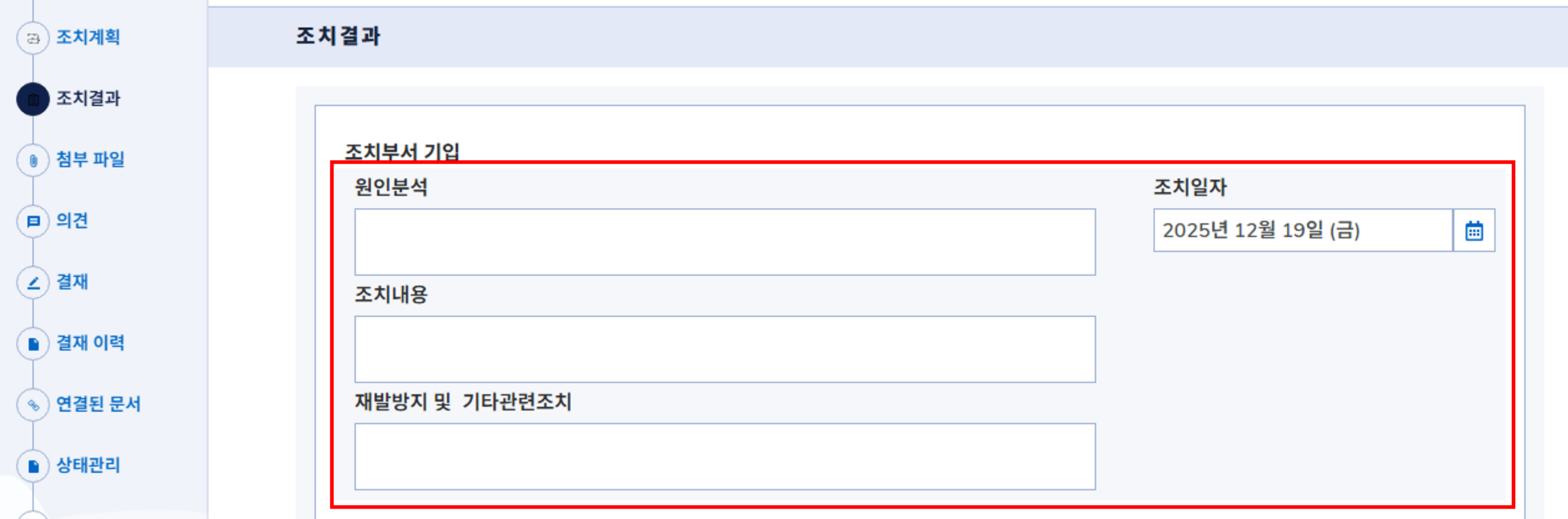 👉 조치 결과 탭 > 조치 내용 입력 > 결재