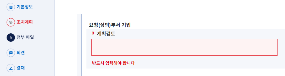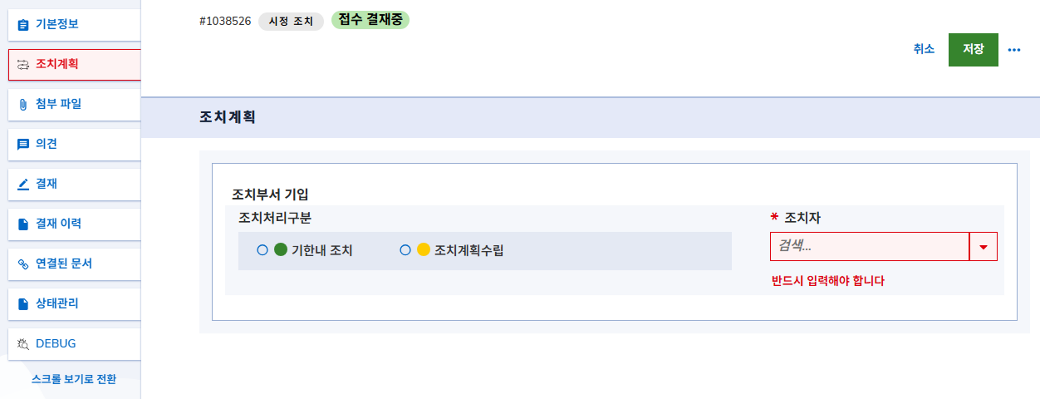 👉 조치 계획 탭 > 조치 처리 구분 > 조치 계획 수립 Click > 조치 예정일 및 조치 계획 입력 > 결재