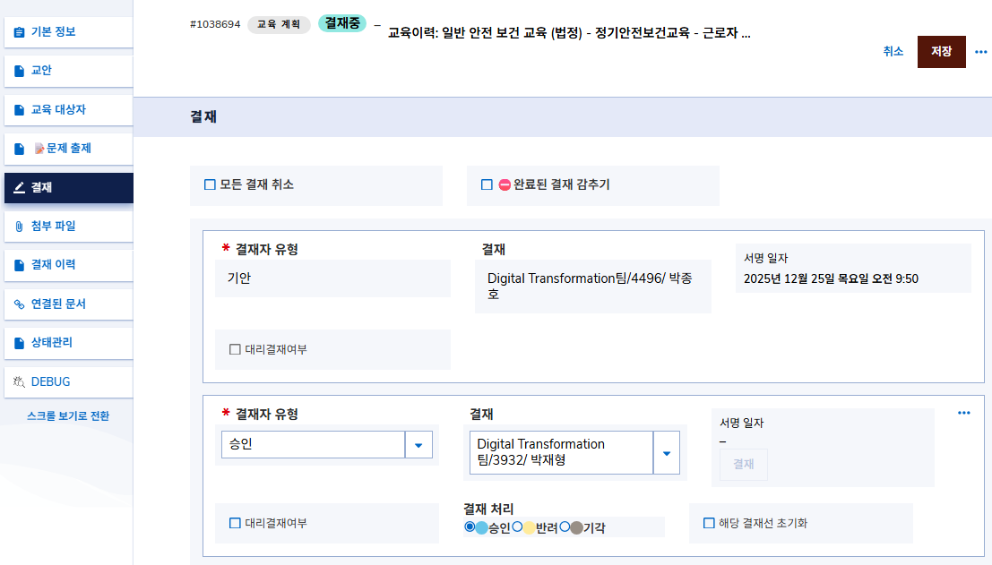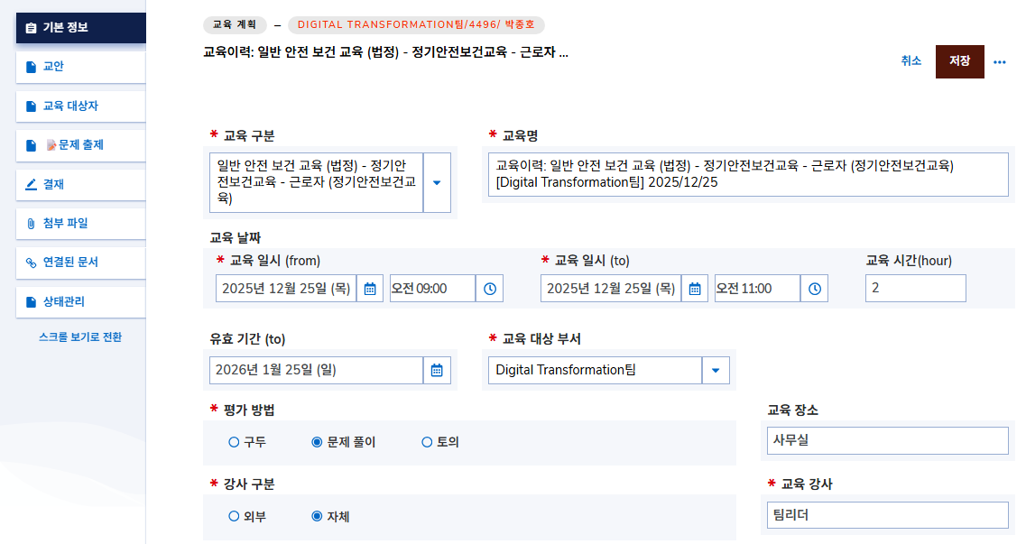 💡 교육 계획 결재가 완료되면 자동으로 교육 결과 문서가 생성돼요 ! 생성된 교육 결과 문서는 연결된 문서에서 확인 가능해요. |