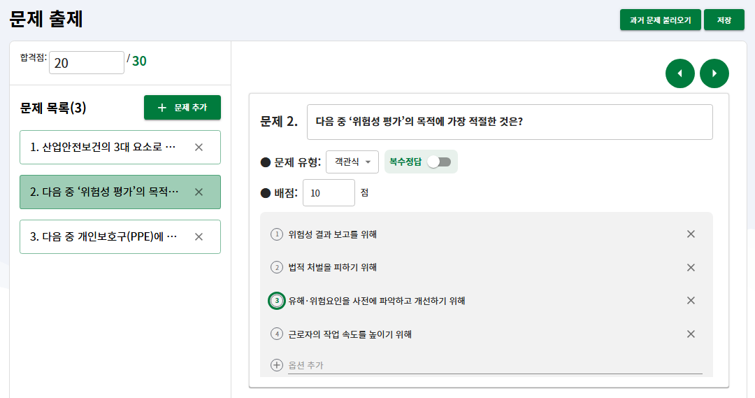 💡 객관식/주관식 모두 출제 가능하며, 과거 문제 불러오기를 할 수도 있어요.