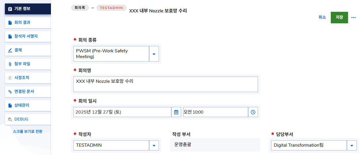 💡 PWSM, BBS위원회, 안전면담과 같은 회의 종류에는 기본 회의내용 틀이 설정되어 있어요. |