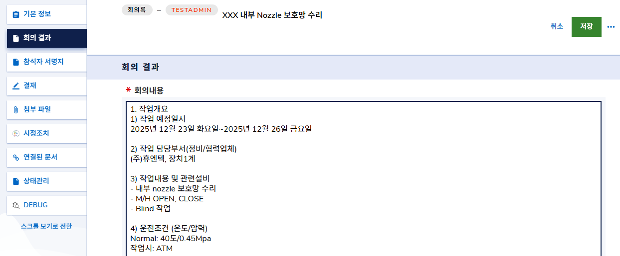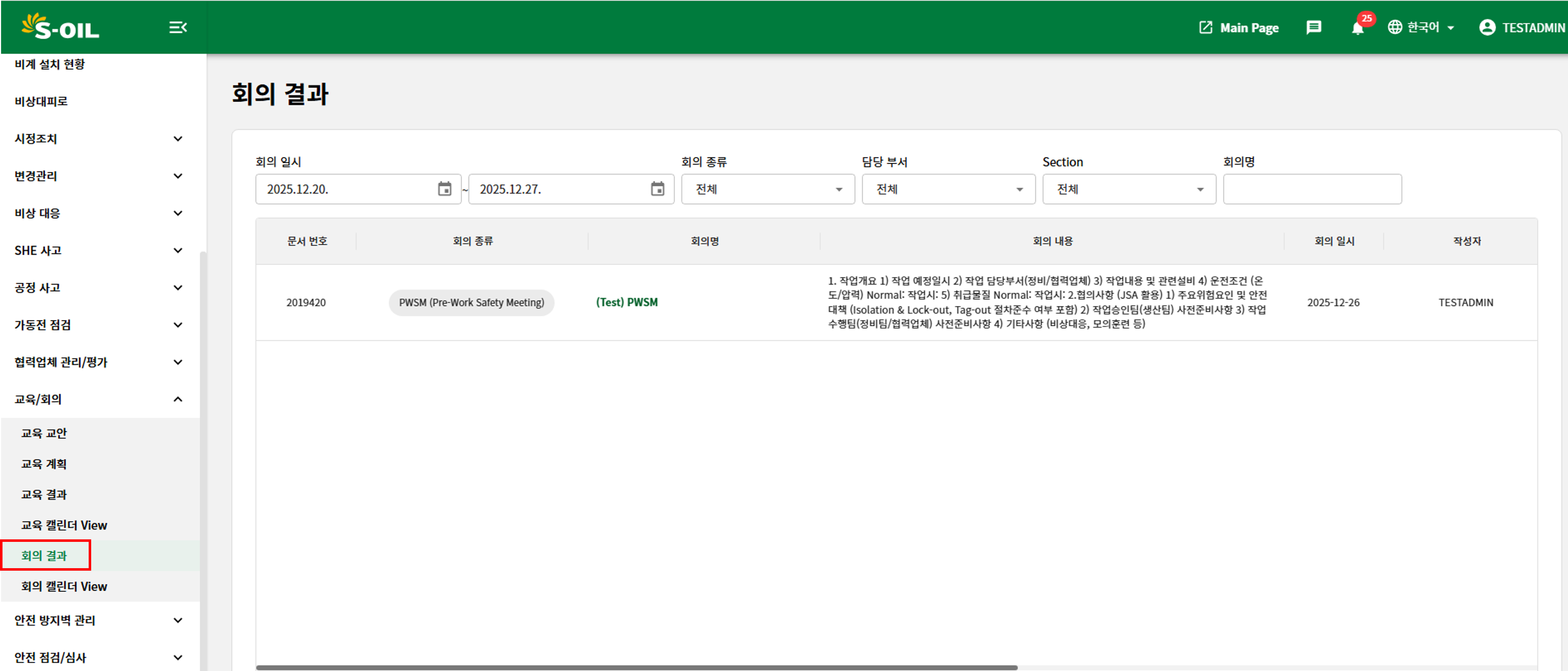 👉 메인페이지 > PSORMS 결재/관리 > 교육/회의 > 회의 결과 |