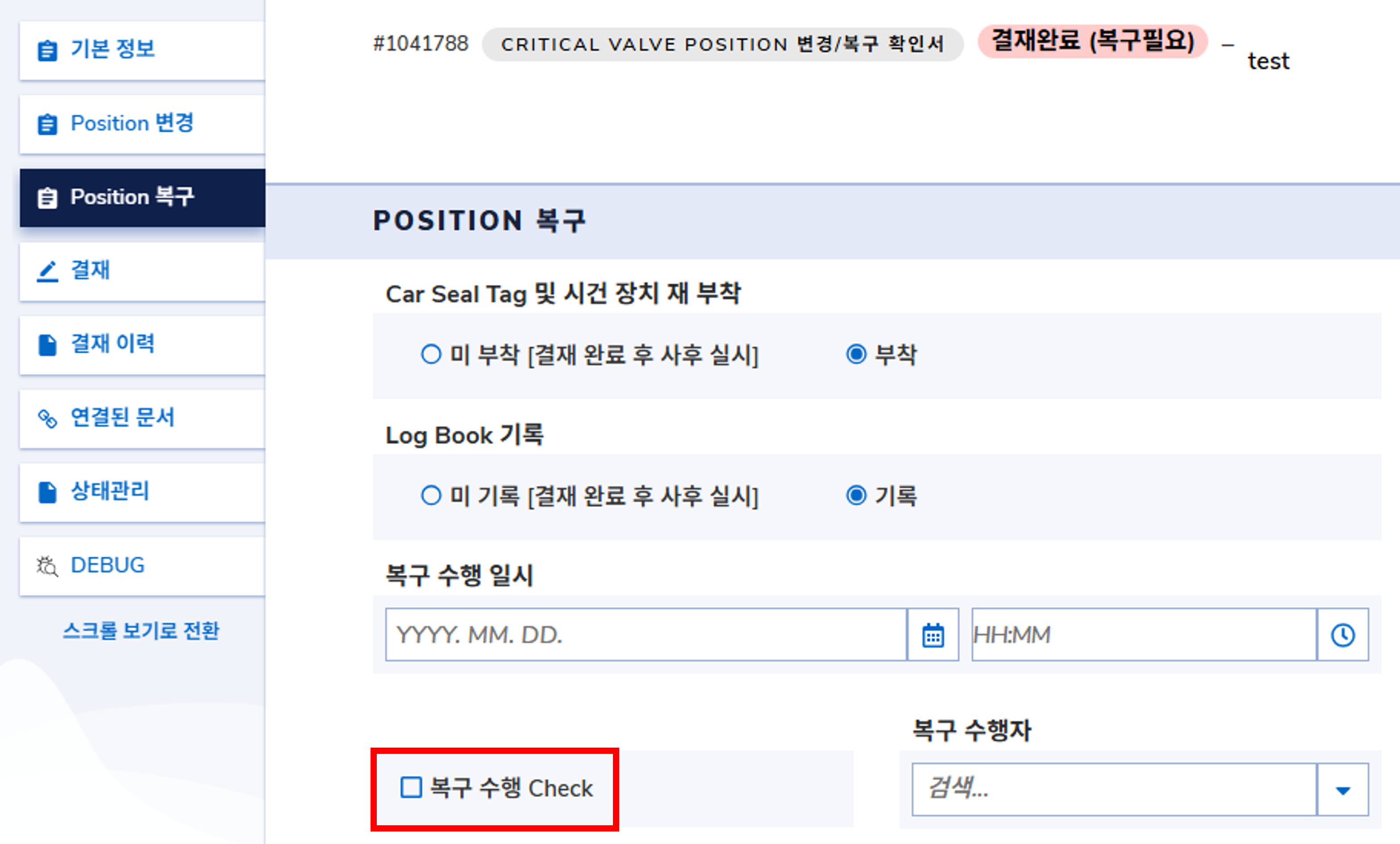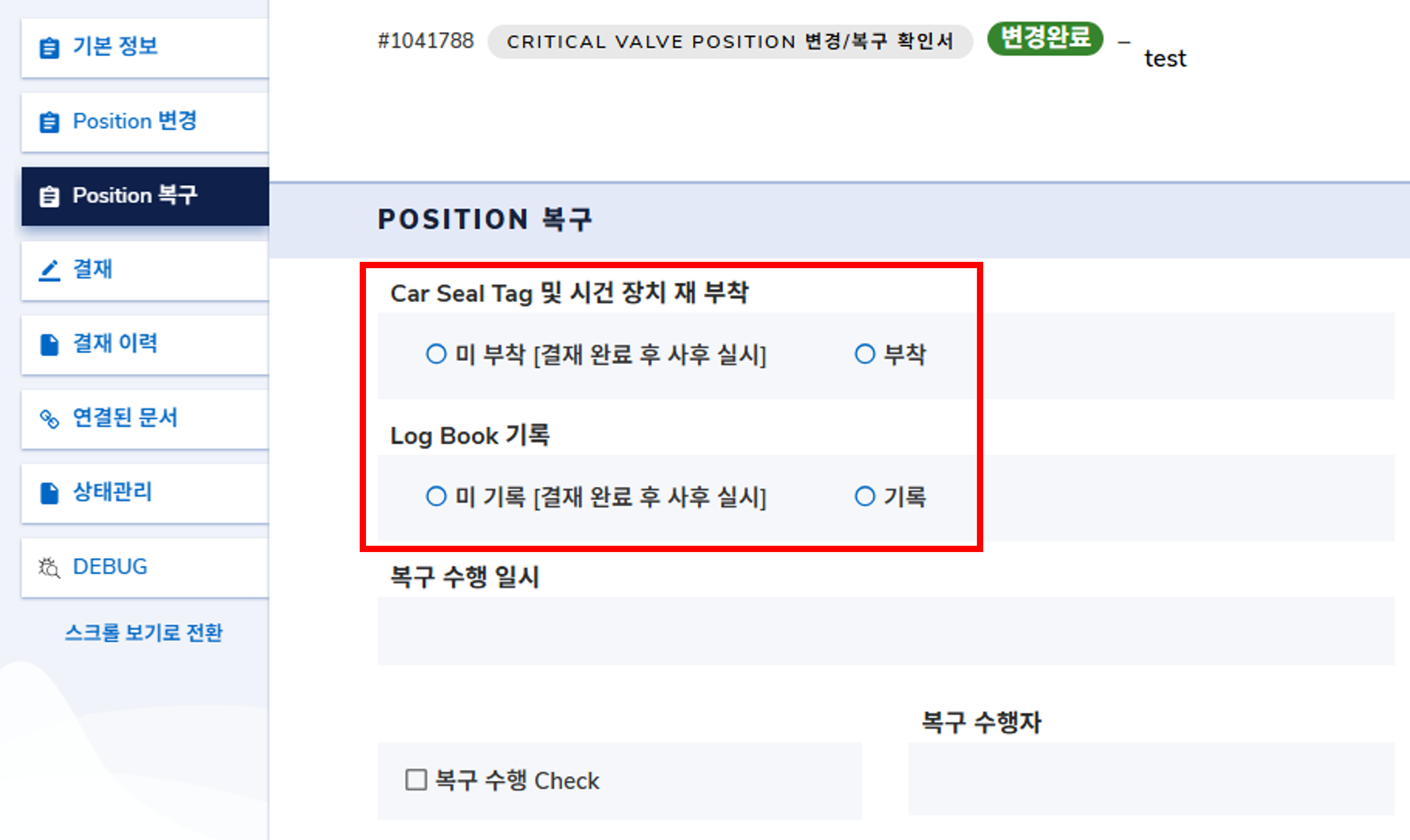 Critical Valve Position 변경/복구 확인은 Critical Valve Car Seal 관리절차[SOM-0-710]에 따라 구현되었습니다.