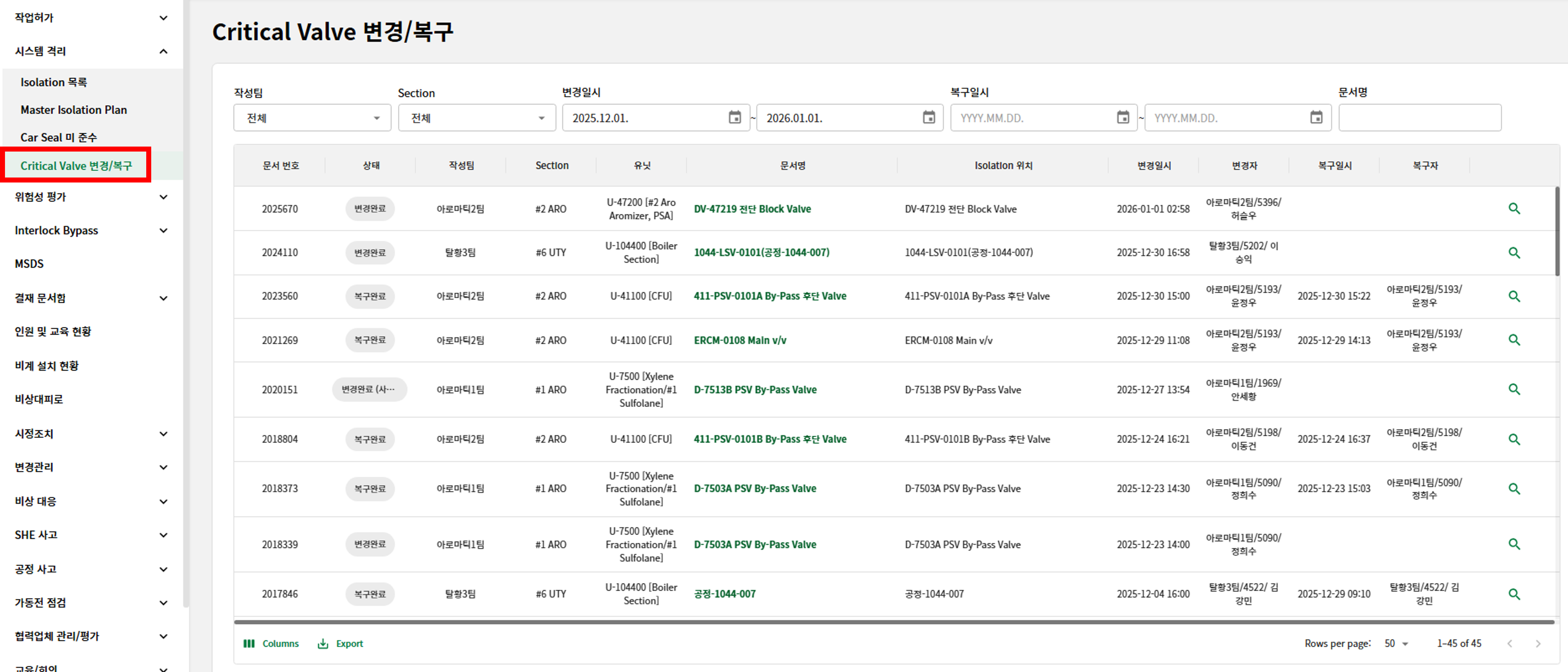 Critical Valve Position 변경/복구 내역 조회